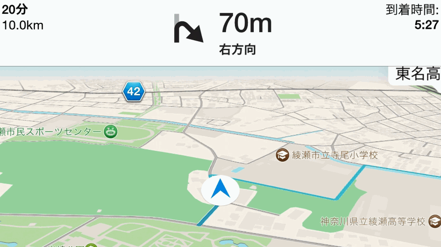 こちらはiPhoneのiOSのマップのナビ画面。