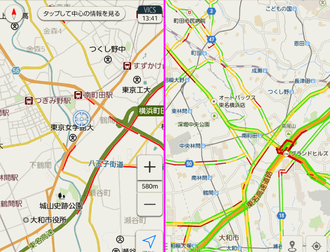 こちらは、左が「Yahoo!カーナビ」のVICS。