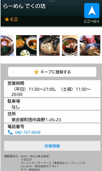 ぐるなびなどとも連携していて、お店の情報や評価、写真なども表示してくれるのが特徴。