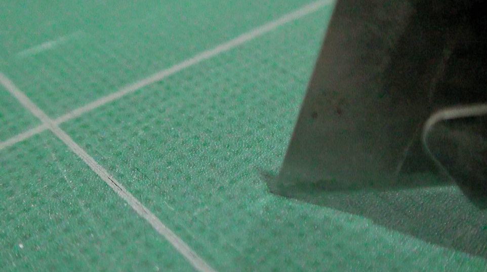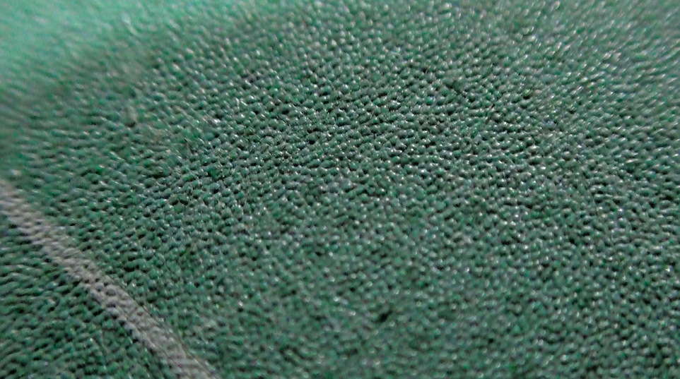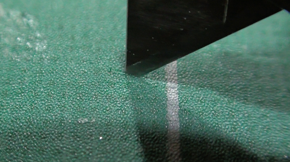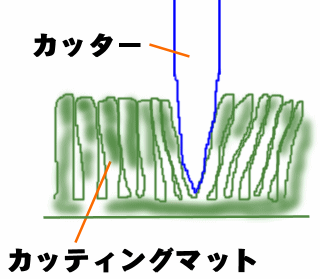 私の想像ですが、このUCHIDAのカッティングマットは断面がこんなふうになっていて、ジュウタンのようなゴムが無数に敷き詰められているような感じなんじゃないかな。と。