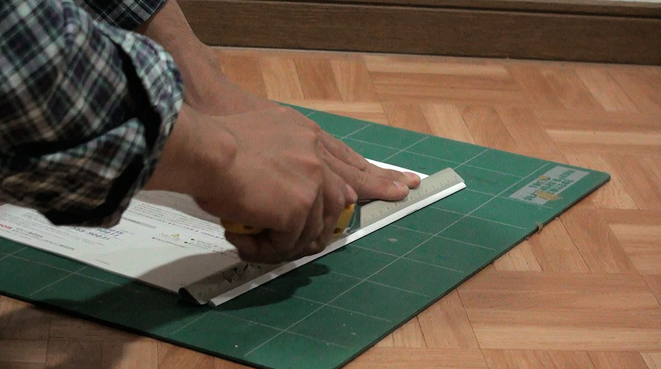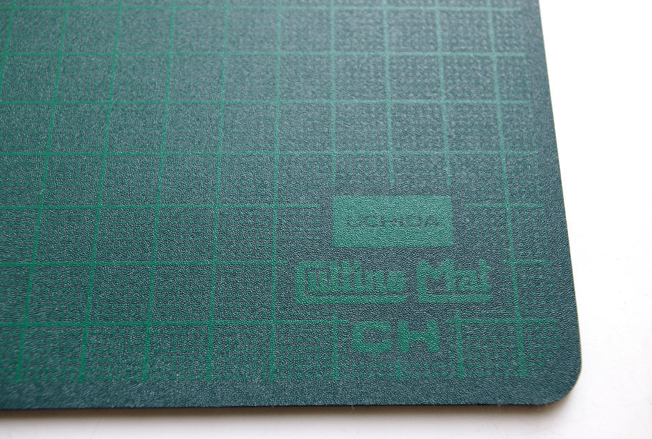安いカッターマットは単に固いゴム製で、何度も使っているうちに表面がボロボロになってくるのですが、私が使用しているUCHIDA カッティングマットは、ちょっと値段は高いものの、特殊な表面加工でデザイナーや製図の世界のようなプロが使っている本格的なシートで、カッターで傷をつけても全く傷ができません。