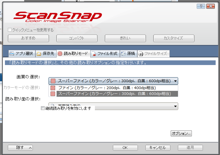 ScanSnapのスキャン解像度や、カラーで読み込むかグレーで読み込むかはScanSnap Managerという付属のソフト上から行うのですが、初心者でも使いやすくしているためか設定項目が非常に少ないです。