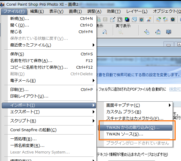 TWINとは付属のソフト以外の画像加工ソフトやOCRソフト等から、スキャナーを操作できるドライバーの機能の1つなのですが、TWIN対応のスキャナだと画像のようにソフトの「メニュー」の中の「インポート」とか「スキャナー」からスキャナーを操作できるんです。