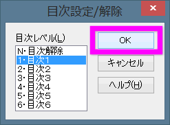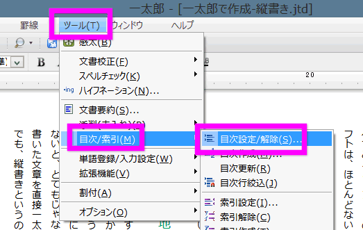 目次を作成するには、「ツール」の「目次/牽引」を選択。