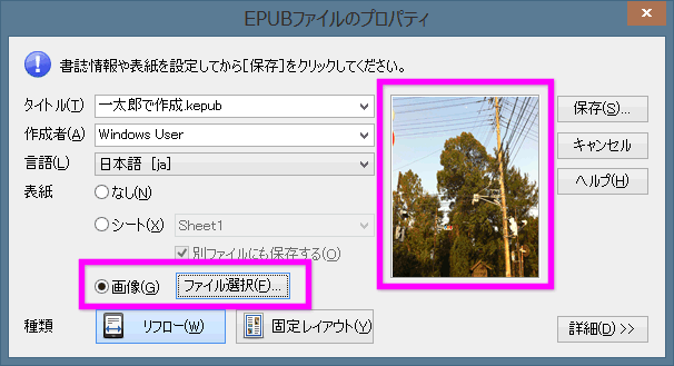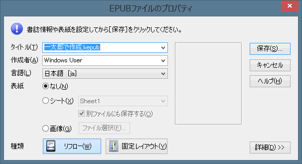 「種類」にある「リフロー」と「固定レイアウト」は、アプリのほうで文字のサイズなどを変更させた場合に、文字の大きさに合わせてページの表現を自動的に変える「リフロー」と、作成したままを表示させたい場合の「固定レイアウト」を選択できます。