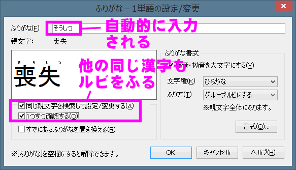 もし、すべての漢字に同じふりがなを振りたい場合は、「同じ親文字を検索して設定/変更する」にチェックを入れます。