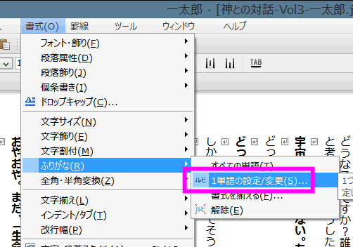 「書式の中の「ふりがな」の中にある「1単語の設定/変更」を選択します。