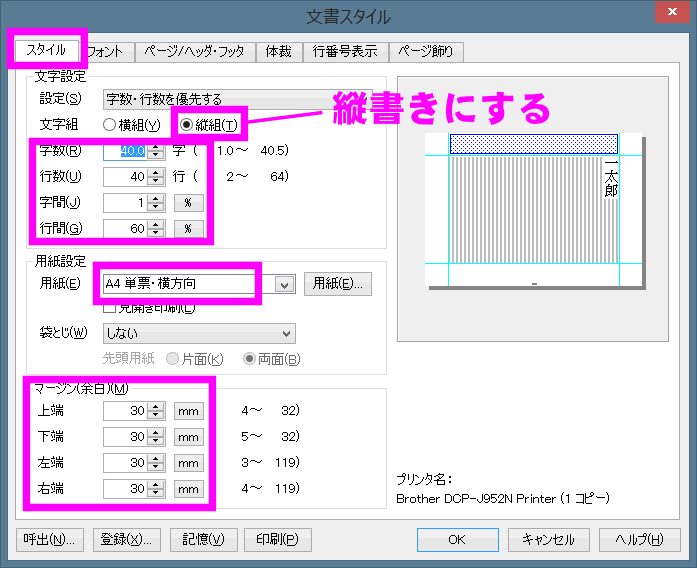 続いて「字数」「行数」「字間」「行間」をそれぞれ「40.0」「40」「1」「60」にします。