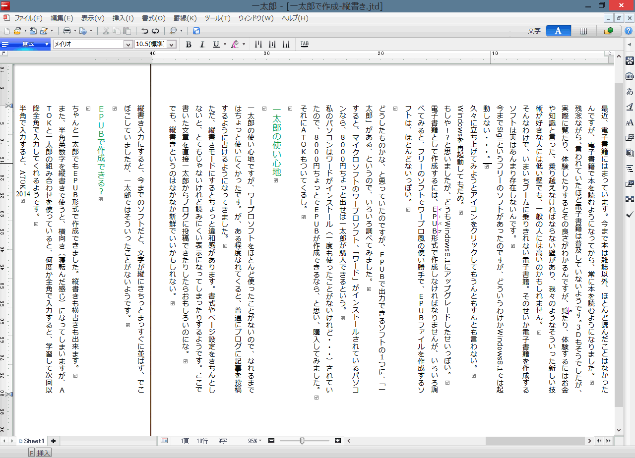 Sigilでは、縦書き表示させると、文字が横向きになってしまうんですが、一太郎ではきちんと縦書きに表示されます。