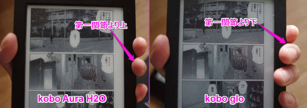 kobo gloの時は片手で持って読んでいましたが、Aura H2Oだと両手で持つことが多いですね。