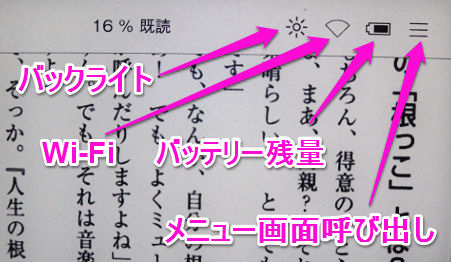 今まではワンタッチで点灯・消灯できましたが、Kobo Aura H2Oでは、画面の何処かをタッチして、メニューバー(?)を表示し、メニューバー上のボタンをタップしないとならなくなりました。