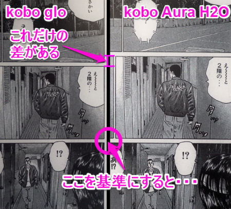Kobo gloは、CBZ形式のファイルも表示さられるので、Aura H2Oと比較してみました。