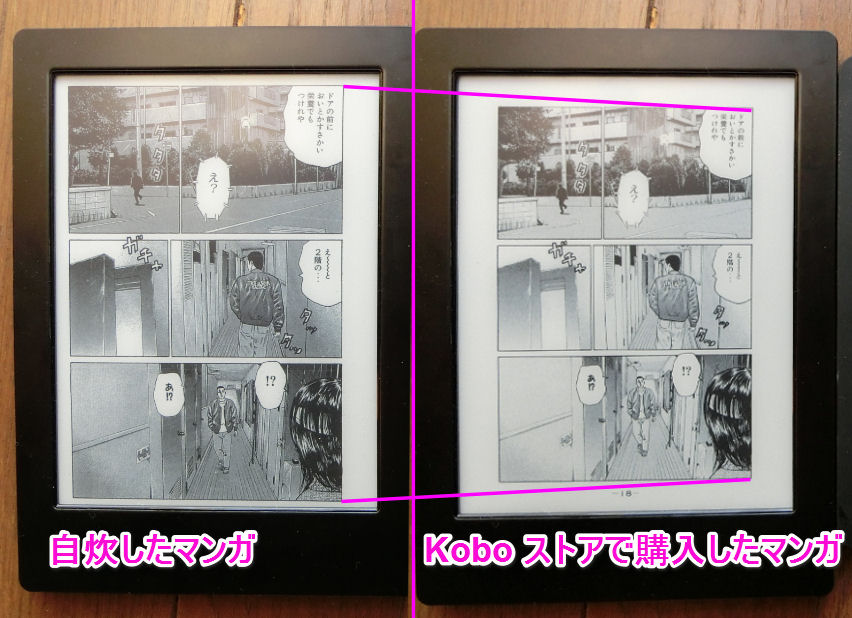 左は自炊して取り込んだマンガを表示したKobo Aura H2O。
