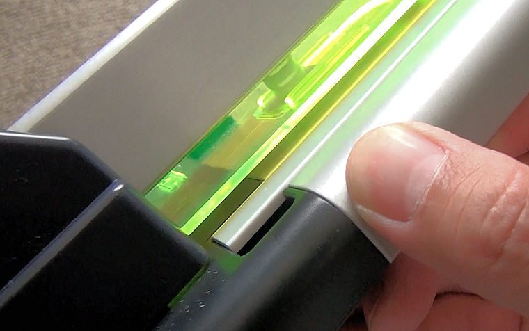 このロックを持ち上げると、黄色の蛍光色の押さえが持ち上がり、切断する本を入れることができます。