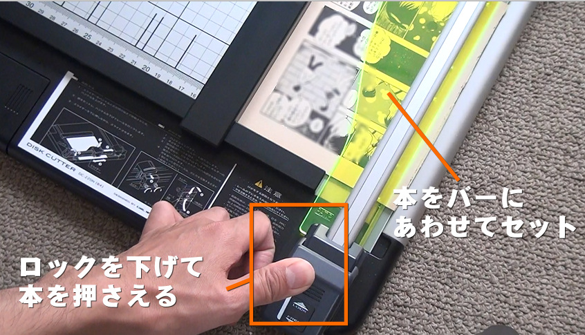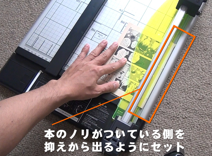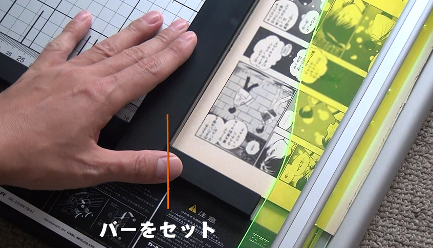 切断する幅を決めたら、位置調整用のバーを本の端に合わせます。