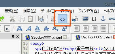 Sigilには、ルビを挿入するボタンはないので、タグ編集モード(画像の資格で囲まれた部分のボタン)をクリックします。