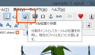 続いてSigilの上のメニューにある「カーソル位置で分割」(画像の資格で囲まれているボタン)をクリックします。