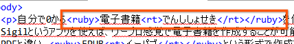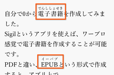 EPUBもXHTMLで記述されているため、ルビ(ふりがな)をつけることができます。(画像参照)