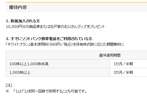 で、SoftBankの株を持っていると、株主優待でホワイトプランが半年に1回、1ヶ月間無料になるようです。
