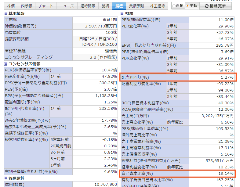 ドコモは自己資本比率が72.86%で配当利回りが4.53%と、いいかもしれない。