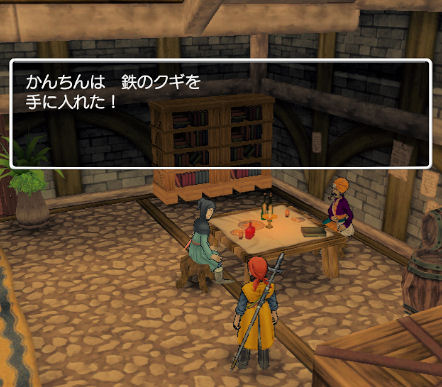 港から外にでるときに通過する大きな宿屋の1階に、男性が二人いるので、一人に声をかけると「鉄のクギ」をもらえます。