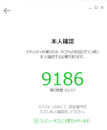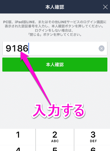 スマホのLINEを立ち上げると、本人確認画面になっているので、Chrome版LINEに表示された4桁の確認コードを入力します。