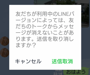 このような警告(相手のLINEのバージョンが古すぎると、消せない可能性がある)が表示されるので、「送信取消」をタップします。