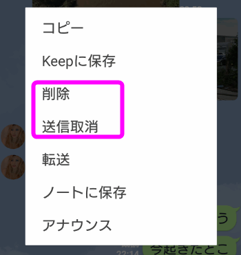 1つは、自分のLINEに表示されている履歴を削除(相手側は削除されない)する「削除」と、自分も相手側も両方の履歴を削除する「送信取消」です。