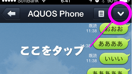 ブロックをしたい場合は、ブロックしたい相手とのトークの右上の下向きの三角のようなボタンをタップします。