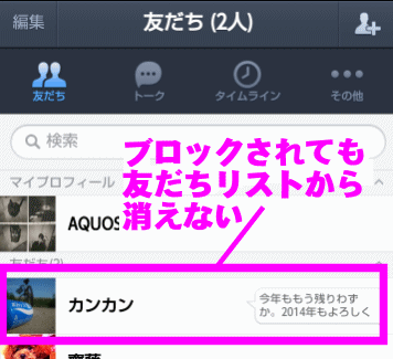 された側は、ブロックされても友だちリストから相手が消えるわけではありません。