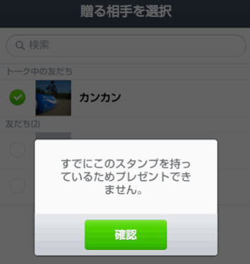 ブロックされていると「すでにこのスタンプを持っているためプレゼントできません」と表示されます。