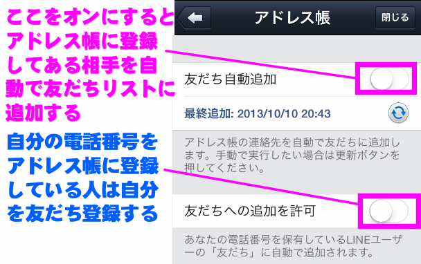 上の「友だち自動追加」は、自分のLINEの友だちリストに連絡先に登録してある人を自動て追加する機能です。