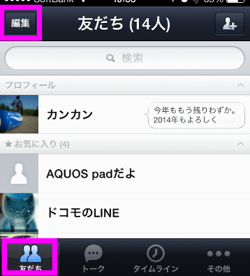 非表示にするには、まずは友だちリストを表示させ、左上の「編集」をタップします。