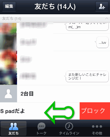 もしくは友だちリスト上のブロックしたい相手の名前の上を指で右から左へスワイプすると、ブロックと表示されるのでここをタップするとブロックすることが出来ます。