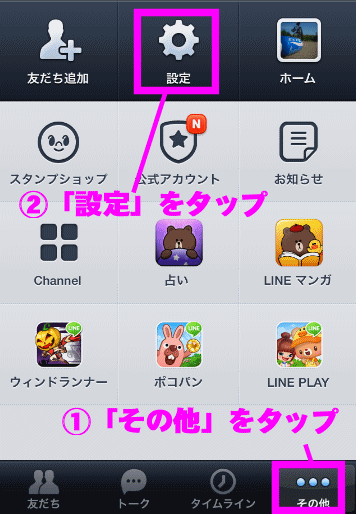 もし、相手とのトークが残っていない場合は、①「その他」をタップし、②「設定」をタップ。