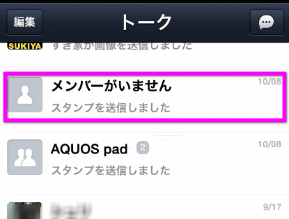 なお、LINEのアカウントを削除すると、相手の友だちリストから消えます。が、一回でもメッセージのやり取りがあると、相手にはこのように「トーク」にログが残ってしまいます。この時、自分の名前が「メンバーがいません」となって残ります。