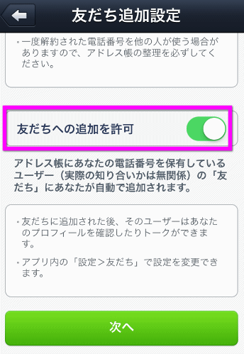 「友だちへの追加を許可」を「オフ」にしておきます。