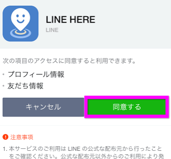 LINEに登録してあるプロフィールや友達のデータを参照していいか聞いてくるので、「同意する」をタップします。