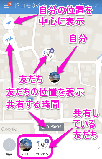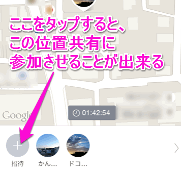 新たに別の友だちと位置情報をシェアする方法は、地図上にある「招待」という部分をタップします。が、ここをタップして紹介した場合、ここに表示されているメンバー全員と位置共有できてしまいます。