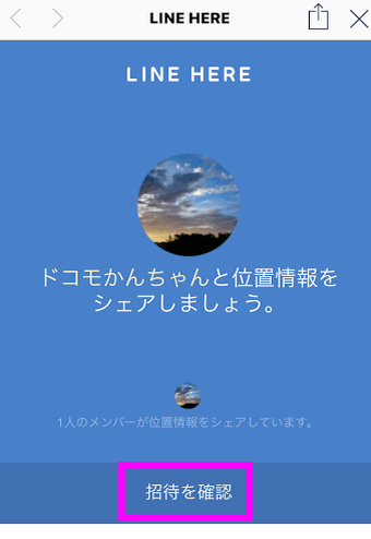 もし、相手がまだLINE HEREをインストールしていない場合、このような画面になり、「招待を確認」をタップすると・・・