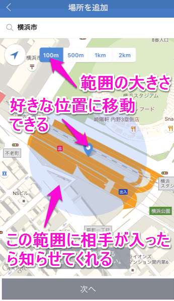 範囲は、100m、500m、1km、2kmから選択できます。相手が指定した範囲に入ったら(もしくは離れたら)、スマホに通知が入るように出来ます。