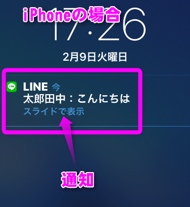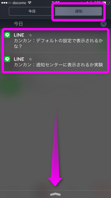 iPhoneの場合、画面の上から中央に向かって指をスライドすると出てくる「通知センター」にも、LINEの未読メッセージが表示されるので、ここで読んでいれば、相手に既読がつきません。