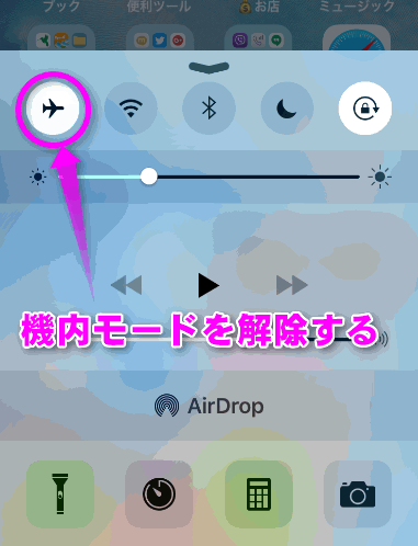 画面の下から上に、指でスライドさせると、「コントロールセンター」が表示されるので、左上の飛行機のアイコンをタップして、「機内モード」にします。