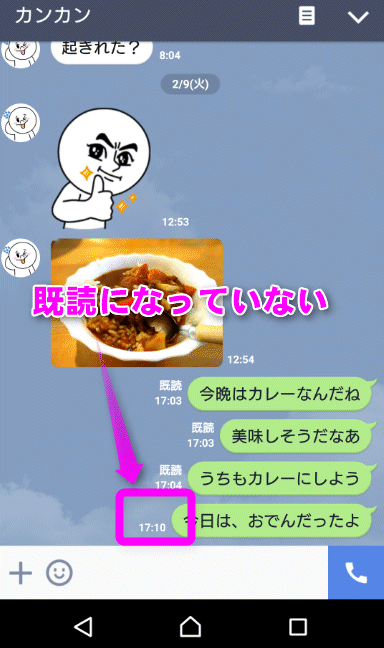 メッセージも表示されていますが、これを見ただけでは相手には既読にはなりません。