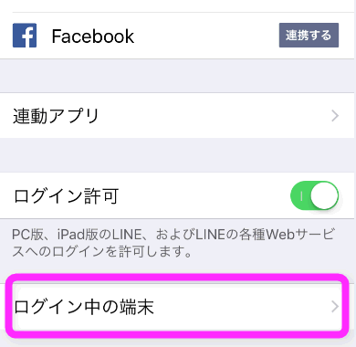 もし、iPadやWindwosなどでLINEを使いたい。という場合は、「ログイン許可」はオンのまま、「ログイン中の端末」をタップします。