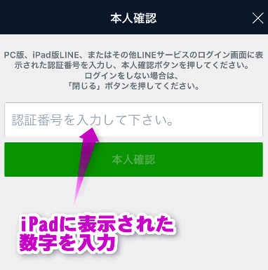 - スマホのLINEに表示される4桁の数字を入力しないとiPad版LINEでは使えない