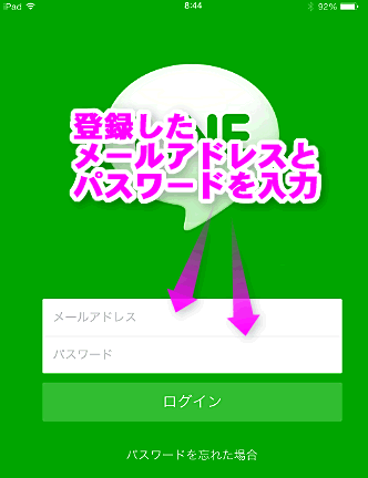 iPhoneやスマホのLINEで登録したメールアドレスとパスワードを入力します。