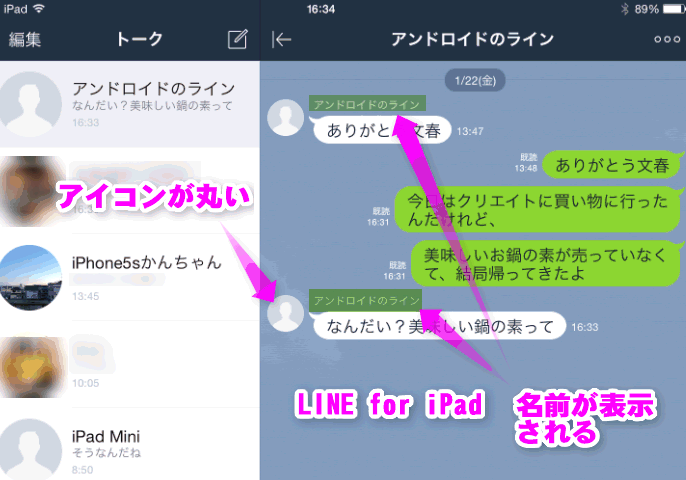 このようにiPad版のLINEでは、現在(2016年1月)でもトークに相手の名前が表示されています。