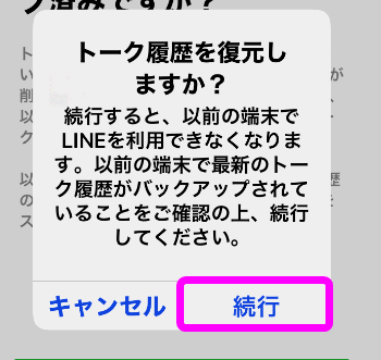 新しいスマホのLINEが使えなくなるという警告が表示されるので、「続行」をタップ。