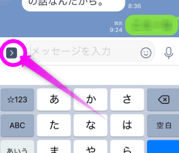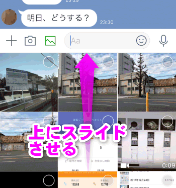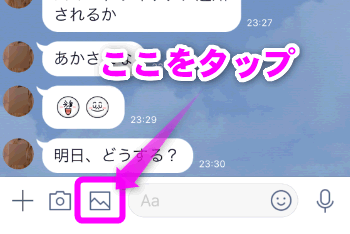 LINEで動画を送るには、まずは写真送信のアイコンをタップします。
